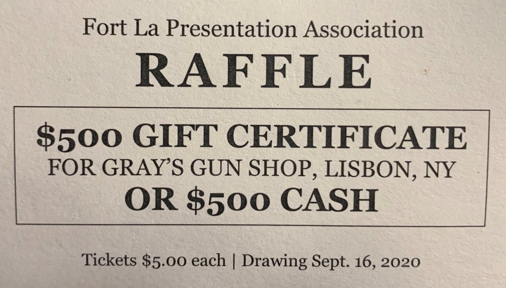 The winning ticket has a choice of either a $500 gift certificate to Gray’s Gunshop in Lisbon, NY or $500 in cash (USD). The drawing will be held on September 16, 2020. All proceeds from the raffle will be used to match the Northern New York Community Foundation challenge grant.